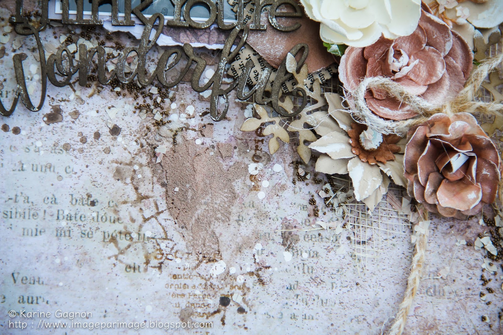On the left side of the layout, I used the Royal Border, which I painted with an aqua metallic paint. While the paint was still wet, I sprinkled some Imagine Ink pearl embossing powder and heat set it. I love the end result. I also used a speech bubble with a heart (I hid the tail of the speech bubble under my flowers) from the Picture Perfect set. It was given the same treatment as the Royal Border.